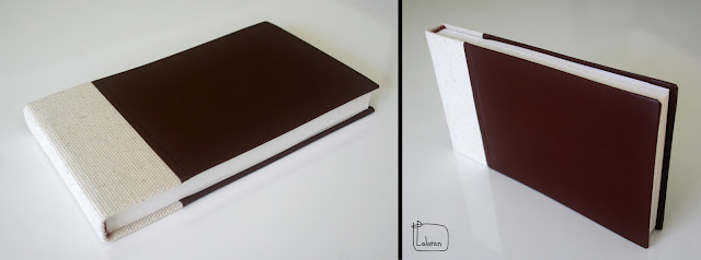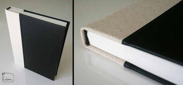 Caderno de capa dura cinzenta e lombada em tecido.